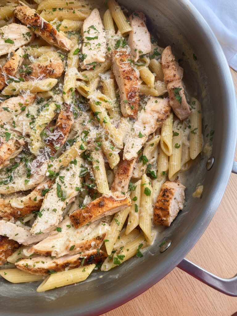 - Combine with Chicken: Slice the rested chicken into strips and add it to the pan with the pasta. Toss everything together until evenly combined.