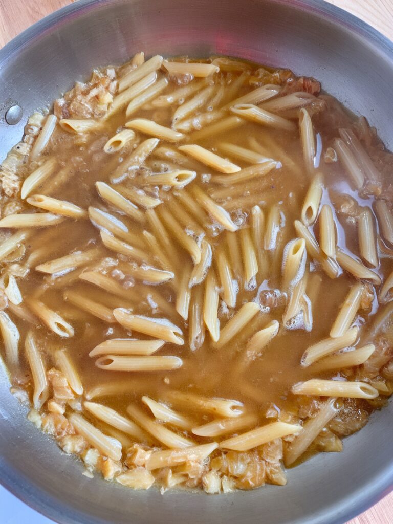 - Cook the Pasta: Add the dry penne pasta, stirring to ensure it’s submerged in the broth. Cover and cook for 10 minutes, until the pasta is al dente.